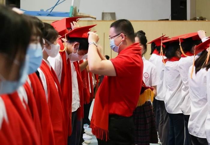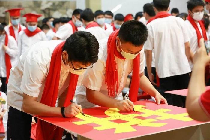 周锦泉校长,张旭副校长带领班主任为学生佩戴成人帽、颁发《中华人民共和国宪法》读本。成人是一种超越生命时间尺度的责任与担当。头戴成人帽,手捧《宪法》,这一刻他们已是肩负责任与使命的成人了,寓意着同学们要以共和国公民的身份去承担起法律赋予的权利和义务!同学们要用一往无前的勇气去面对高考,面对未来的人生。