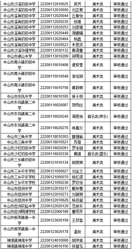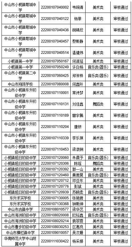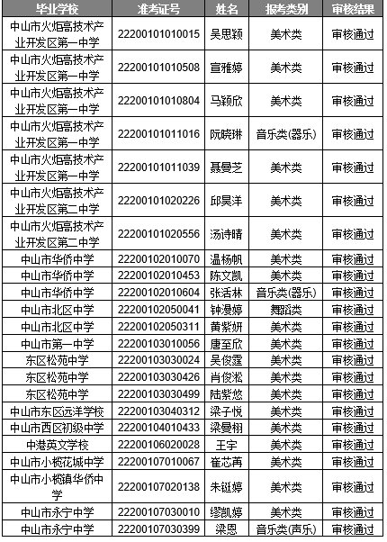 根据《2022年中山市东升高级中学艺术生招生方案》相关规定,审核报考我校艺术生的考生的资格。合格名单公示如下: