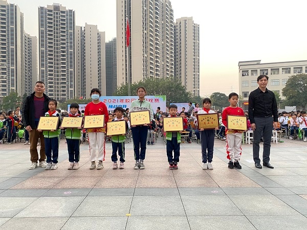 本次比赛活动提前做了详实的预案,场地的布置,人员的安排,师生裁判员的培训,暖场节目的训练都做好充足的准备。活动开始前,商场表演的暖场节目是扇子舞和独轮车混合表演,同学们均身着红色服装,伴随着轻快律动的乐曲声,自如穿行在红色的扇子舞的海洋中,扇子阵型的变换自如和一张一翕发出的震天响声,拉开了活动的序幕。随后,比赛正式开始,首先是班级全体学生个人跳,低年级的小朋友们乖巧跟着引导员到达比赛位置,跳起绳来身姿舒展、动作规范,不落下风;高年级的同学基础扎实,跳绳时挥动绳子的嗖嗖声此起彼伏,场面一片紧张而热闹。接下来是跳长绳比赛,各班队员有序上场,在同学们的加油声中,配合有方、紧张有序地完成比赛。为了给同学们增加更多活动亮点,语数英和综合科四个科组分别选派了教师上场,为同学们展示了一场同样紧张而精彩的教师跳长绳比赛。比赛完成后,裁判员当场宣布了获得跳绳比赛前八名的班级,并进行了颁奖,同时还表彰了个人跳绳获得成绩前十的各年级男女同学。