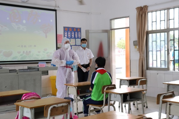 校园安全无小事,在新型冠状病毒流行的今天,为了进一步保障校园师生生命安全和身体健康,5月9日下午,阜沙镇罗松小学举行了校园新冠肺炎疫情防控应急演练,全体教职员工、行政参加了演练。演练中,阜沙镇党委副书记孙海卿、文教卫计局局长黄桂生、社区卫生服务中心主任黄极信、教育事务指导中心主任徐瑞钦出席,并全程观摩了演练。