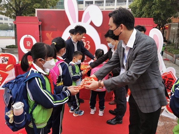 春风十里,不如校园有你。2月6日上午,怀着对新学期的美好期待,罗松小学学子开心步入阔别两个月的美丽校园。为更好迎接同学们归来,学校开展了以“感受传统文化,喜迎癸卯兔年”为主题的欢迎仪式,仪式设计兔年主题展台,展台两边是双兔拜年,中间放置充满粤式谐音祝福的果蔬礼品,寓意聪明、勤恳、平安等,寄托对同学们的深深祝福,同时安排六位舞狮少年,头顶狮子,分置走道两侧,醒狮开门,为同学们鼓舞斗志。学校还用心为每位同学准备了一份写满新春寄语的特殊红包,包含着罗松小学老师们的一份份殷切祝福和期望,激励同学们以昂扬斗志,满怀激情投入到新学期的学习中去。