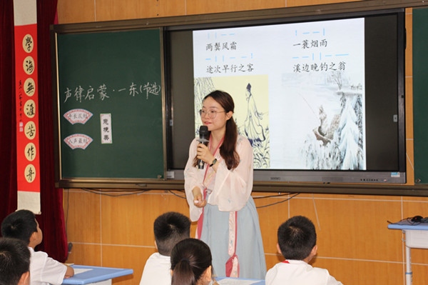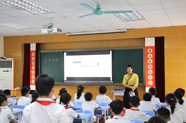 督导组成员首先在校园观看了传统文化节目表演。在现场,大课间、民乐表演展示了自己的风采,吟诵社团给大家吟诵了《三字经》和《论语》,孩子们的展示给大家留下了深刻的印象,得到了大家的一致好评。随后,民众育才小学林丹凤老师和阜沙中心小学周棠英老师先后为大家呈现了两节传统文化教育课例——《声律启蒙?一东》和《行孝感恩》。课堂中,林老师引导学生用不同的诵读方式,理解文意,感悟境美;周棠英老师与学生在快乐中学习,并能通过与生活相结合,感悟关爱父母,及时行孝。