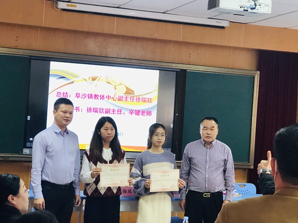 最后,辛键老师和阜沙镇教育和体育事务中心的徐瑞钦副主任为郑纯老师和郑坤老师颁发了证书。