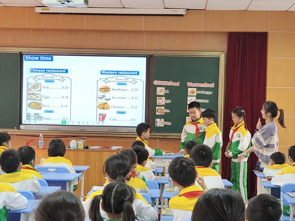 活动首先由阜沙中心小学郑纯老师和东凤同安小学郑坤老师同课异构。教学内容选自三年级Unit5 Let’s Eat!(PartB Let’s talk&Let’s Learn)。两位年轻有活力的郑老师为孩子们带来了两节优质高效的课例。郑纯老师从歌曲“Let’s have a picnic today”导入主题,通过学生过往的picnic体验,激发学生表达已学过和未学过的picnic所需的食物名称。进而创设have a picnic和order the meal的情景主线,引导学生学习理解文本内容。通过创编对话引导学生应用实践。再通过创设餐馆点餐的情景实现迁移创新。郑坤老师依托order the meal at the restaurant的主情景,先是书中的角色点餐,再巧妙地过渡到同学们自己点餐,情景创设自然真实。郑坤老师运用POA产出导向法,为学生的学与用的输入与输出构建起了桥梁。郑坤老师自信活泼的教学风格引领学生积极投入课堂学习。