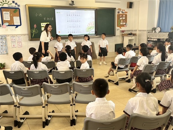 首先,调研组和语文科组的全体老师共同观摩了一年级刘凯银老师展示的课例《小池》。课上,刘老师运用各种诵读的方式,带领学生感受古诗当中的韵律之美,并通过图文结合等方法感知古诗所描绘的夏日荷塘的和谐与情趣,让学生多方位领略中华优秀传统文化吟诵的魅力。课堂上,刘老师还邀请了学校音乐老师为学生们进行古筝伴奏,让学生们在音乐中进一步领略吟诵的美。课后,刘老师大方沉稳,有条不紊地说课,充分展示中山市实验小学教育集团大丰小学青年教师的风采。