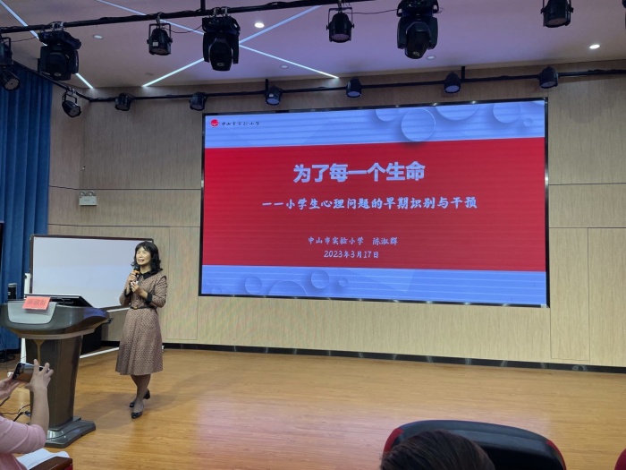 第二个环节,由总校德育处陈淑群主任进行主题为“为了每一个生命——学生心理问题早期识别与干预”的讲座。陈主任先列举了与学生心理相关的文件,论证了中小学心理健康教育的重要性。接着用大量的真实案例剖析了当前青少年儿童心理问题的多样性和复杂性,帮助教师们走出对心理健康问题的认识误区,让教师们能更加准确、更加及时地发现学生异常行为背后的心理症结,从而和家庭、社会协同应对,早干预、早治疗,为孩子的健康成长保驾护航。