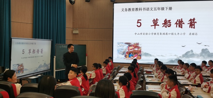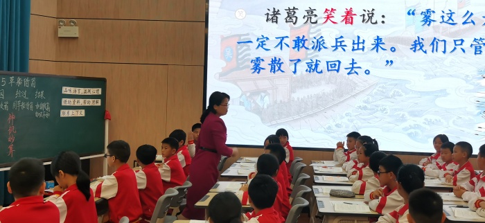 第二环节——方法指导展课堂。梁耀昌老师执教了《草船借箭》第一课时。梁老师首先抓住“军令状”这一着力点,用风趣幽默的语言,通过借助历史资料引导学生概括《草船借箭》的主要内容,然后用“品读语言,揣摩心理”的名著阅读方法初步剖析周瑜和诸葛亮的性格特点。接着卢小娟老师乘胜追击,继续在第一课时的教学路径下,呈现了精彩的第二课时。卢老师巧妙抓住“周瑜大吃一惊,长叹道:‘诸葛亮神机妙算,我真比不上他!’”这一句话作为授课线索,贯穿全堂,耐心引导学生利用“联系上下文悟形象”的方法从“识天文、晓地理、识人心”三个方面深入感受人物形象。此外,卢老师还巧妙地利用阅读链接对文本进行对比式阅读,让学生习得古典名著阅读的方法——联系上下文猜意思。