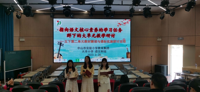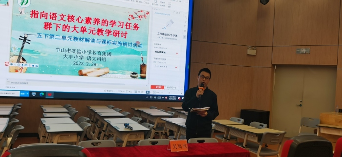 为全面、细致、深入领会新版课程标准的理念,探讨单元整体视域下的教学策略,提高课堂教学实效,推动学生深度学习,促进教师专业发展,2月28日下午,由中山市港口镇教育和体育事务中心主办,中山市实验小学教育集团大丰小学承办的“统编版小学语文五年级下册第二单元教材解读与课程标准实施研讨活动”在大丰小学报告厅举行。港口镇小学教研专干苏彩南老师、港口镇小学语文教研组长吴高欣主任、中山市实验小学黄海庆副主任、港口镇各兄弟学校语文教师代表以及大丰小学全体语文老师参加了本次活动。