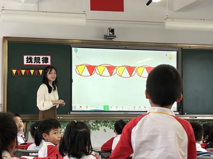活动伊始,大丰小学青年教师吴雁琪老师首先为大家呈上了一节一年级《找规律》的精彩课例。吴老师整节课的设计,基于探究单的前置性学习,通过生生互动,以达让学生在数学课堂上“像数学家一样探究”的学习效果。吴老师先是利用前置探究单学习,激发学生探究的欲望。再通过说一说、找一找、摆一摆、画一画和圈一圈等体验活动,让学生积累活动经验的同时,力求体现新课程标准精神。这节课吴老师设计了贴近生活且富有趣味性的活动,让学生在趣味中欣赏、观察、猜想、验证,在美的感受中学习有趣的数学,给予学生从直观到抽象、从具体到概括地逐步发展的空间。