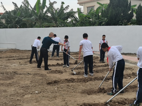 分成四组的同学们在老师的带领下,带着好奇和兴奋走进耕地,分别负责除草、翻地、种植和浇水,德育处主任谢元新示范如何正确使用耕田工具以及耕田时所要注意的细节。翻地的同学举起手中的锄头,努力的翻地,种菜的同学认真的给菜苗培土,负责浇水的同学小心翼翼的淋菜。劳动过程热火朝天,同学们都展现了自己的动手能力,成为了一个个劳动小能手。