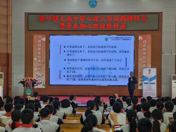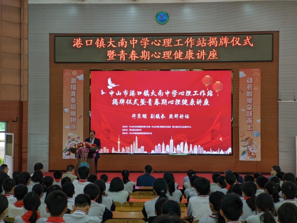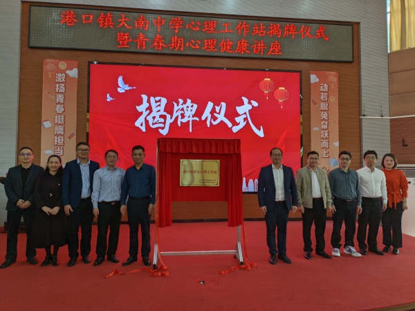 为扎实推进健康中国、教育强国建设,关注学生心理健康,积极开展校园心理咨询服务工作,2023年2月9日上午,由港口镇大南中学德育处主任许春娜主持的港口镇大南中学心理工作站揭牌仪式暨青春期心理健康讲座在学校一楼阶梯室举行,中山市第三人民医院院长蒋廷云、中山市港口镇人民政府副镇长易昊宏、许策明,中山市卫生健康局港口分局局长吴中明、中山市港口镇教体文旅局副局长刘长路、中山市港口镇教育和体育事务中心主任张育文、中山市港口镇大南中学校长廖建红、中山市港口镇社区卫生服务中心副主任卢永添、中山市第三人民医院青少年心理专家张世宁出席本次活动。
