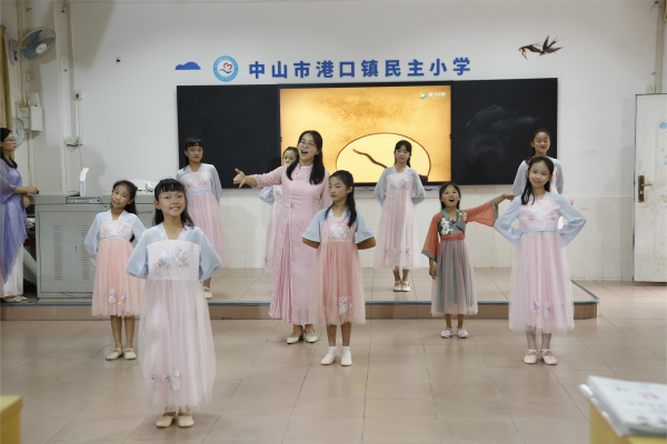 “接天连叶无穷碧,映日荷花别样红。”6月14日下午,中山市港口镇民主小学召开市级立项课题“智慧教育背景下中华经典古诗文与小学学科教学有效融合的实践研究”中期报告会。中山市教育学会会长陈春艳主任、中山市教研室教研员林晓洁老师、港口镇教育和体育事务中心教研专干(课题管理人)苏彩南老师、港口镇兄弟学校教师代表以及本校领导、语文科组教师、课题组全体成员参加了本次会议。会议由周天乐老师主持。本次中期报告会议由课例展示、师生展演、中期汇报、专家点评四部分组成。