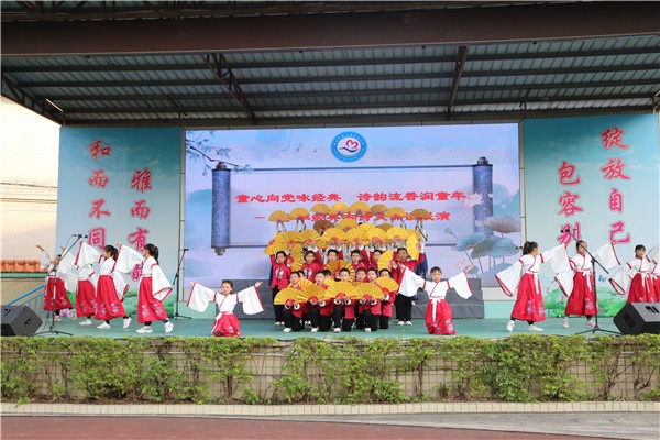 讲座结束后,与会老师在操场欣赏民主小学师生们精心准备的“童心向党咏经典 诗韵流香润童年”——中华经典古诗文诵读展演。序曲“天地玄黄”,全校师生齐诵《千字文》节选,舞动声律,场面恢弘;第一章“诗情画意”,吟诵配以沙画表演,带着大家品读《四季之美》;第二章“踏歌而行”,以诗和舞,倾情演绎《长歌行》;第三章“经典传承”,或吟或歌或舞演绎《九歌·国殇 》《归田赋》《读唐诗》《黄鹤楼》《水调歌头 明月几时有》《天净沙·秋思》,楚辞、汉赋、唐诗、宋词、元曲一一呈现古诗词的发展历程,增强文化自信;终章“中华少年”,全体师生齐诵《少年中国说》节选,点燃爱国情怀,以铿锵誓言传承优秀中华文化。