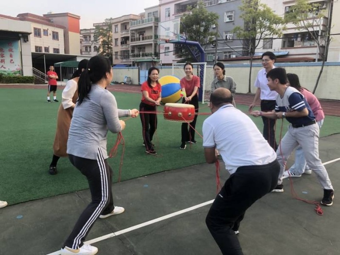 在学校体育组和工会的精心策划下,本次教职工比赛分五组,共设立了穿衣接力、推大球和绳鼓击球三个趣味竞赛项目,活动兼具团队性和趣味性。