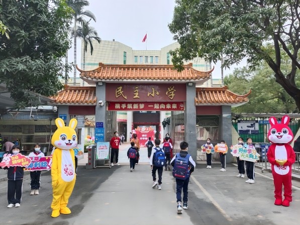 最是一年春好处,万物之美始于此。清晨,远远就看到民主小学校门口校领导、一群穿戴着鲜艳的红领巾的“小兔子们”正给每位入校的同学们发放开学红包。领到红包的孩子兴奋不已,有的手舞足蹈,有的则迫不及待的打开看看里面藏着什么“神秘礼物”,一张张映红了的笑脸在阳光下愈加灿烂。