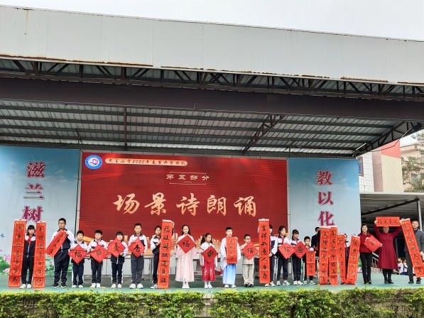 在寒假学习才艺展示中,学生的情景诗歌朗诵《满江红》,铿锵有力的声音,展现了民主学子昂扬向上的精神面貌,激励每一个学生努力谱写自己的《满江红》。笔墨中国风,开卷纸砚香。现场同学们还挥毫泼墨积极展示书法成果,以满怀信心和祝福开启新的学期。