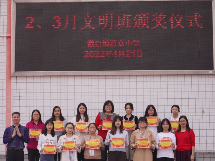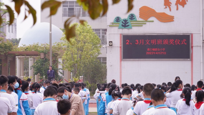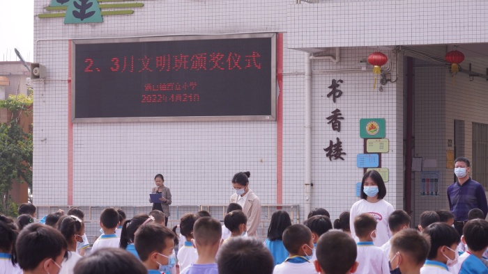 2022月4月21日上午大课间,群众小学少先队少工委举行二、三月份“争创文明班”小结颁奖活动。