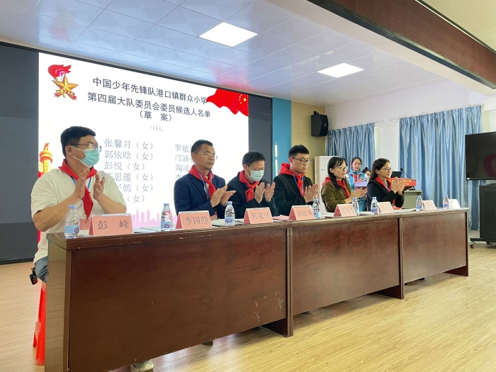 下午3:45,主持人宣布大会开始。会议在嘹亮的国歌声中拉开序幕。接着,出大队旗,少先队员齐唱队歌,气势高昂。少先队副辅导员李园静老师解读红领巾奖章方案,梁铨华校长为获得镇二星章的同学颁发奖章;第三届大队长作少先队工作报告。随后,主持人先后宣读中国少年先锋队中山市港口镇群众小学第二届少工委候选人名单、第四届大队委候选人名单,并获得了全票通过。镇团委副书记宋国飞同志和镇总辅导员曾凡苑老师为学校第二届少工委主任梁铨华、少工委副主席廖洁莹、郭南洪、彭峰颁发聘书,少工委主任梁铨华为第二届少工委委员颁发聘书,并合影留念。