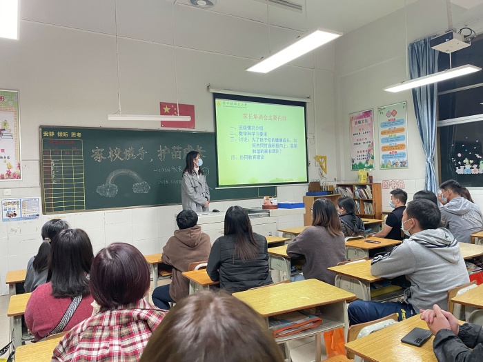 专题讲座结束后,各年级家长走进各班教室,与学科老师开展交流活动。首先,班主任们向家长介绍学生在学校的学习、活动情况,展示学生的过程性评价、优秀作业,班级所获得成绩、荣誉等,让家长真切地了解到孩子们的在校情况。同时与家长交流“双减”政策的内涵、实质,就“双减”背景下如何开展家校共育问题,展开交流与讨论。各科任老师也相互进入到自己所任教的班级,就自己所任教的学科,向家长汇报自己教学时学生的表现,并对学生家长提出切实可行的学习建议。也有不少的班级邀请了优秀家长,与其他家长分享了自己家庭教育的一些经验与心得还有育儿路上的困惑……