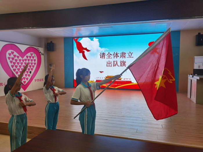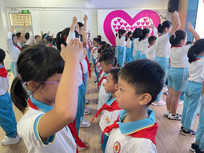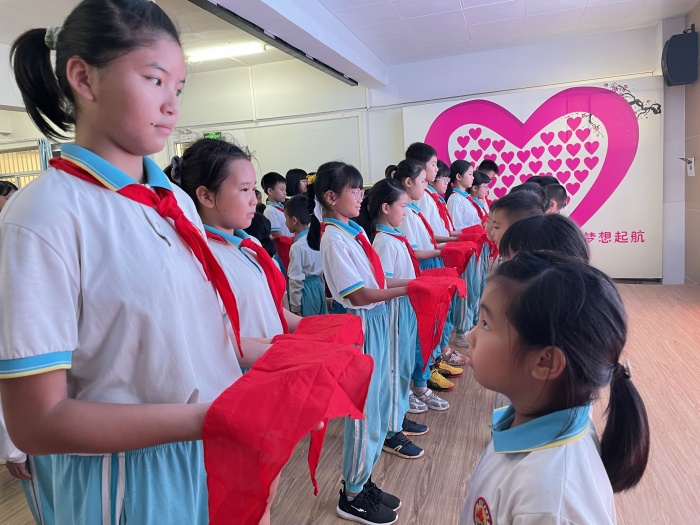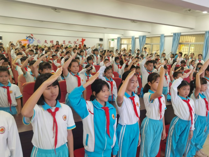 入队仪式在鲜艳的队旗下、嘹亮的歌声中拉开帷幕。首先,大队委李青璇同学宣读入队名单,高年级的哥哥姐姐们为新队员佩戴红领巾。大队辅导员胡婵媛老师带领少先队员在队旗下庄严宣誓。接着,二(1)中队周芷瑄代表全体新队员发言,立壮志、表决心。六(1)中队邝涵睿代表老队员发言,希望新队员努力成为一个自尊、自爱、自强、自律的优秀少先队员。少工委郭南洪副主任对新老队员寄予了厚望,希望队员们好好学习,好好锻炼,在星星火炬的指引下茁壮成长!最后,大队辅导员胡婵媛老师带领全体少先队员呼号,“准备着:为共产主义事业而奋斗”——“时刻准备着!”入队仪式在队员们稚嫩铿锵的呼号声圆满结束。