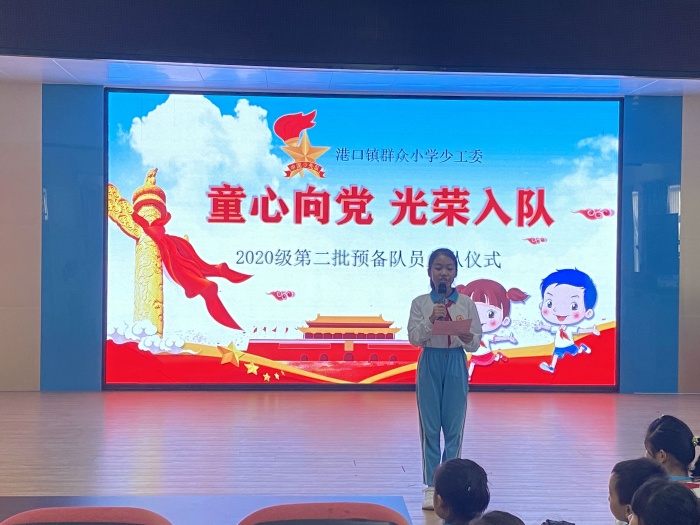 伴随着祖国前进的步伐,中国少年先锋队走过了72年的光辉历程。为了深入学习领会习近平总书记关于少年儿童和少先队工作的重要论述,增强少先队员的光荣感和组织归属感,10月14日下午,港口镇群众小学举行“童心向党,光荣入队”——2020级第二批预备队员入队仪式,团结、教育、引领少先队员健康成长。