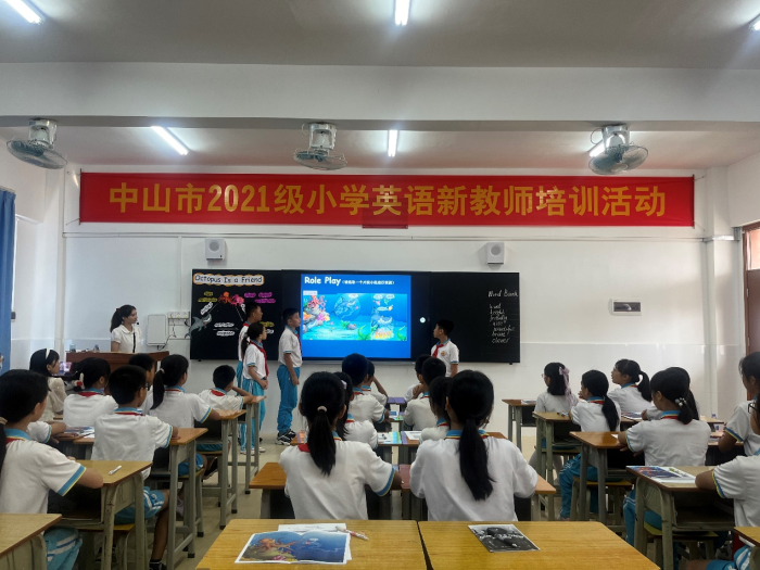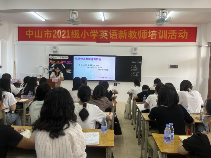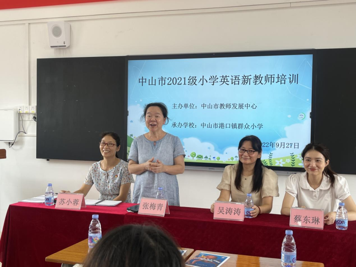 为进一步推动小学英语新教师的专业化成长,增强教师对小学英语绘本教学的认识,2022年9月27日下午,中山市2021级小学英语新教师培训活动在港口镇群众小学举行,活动主题为“优秀绘本课例赏析”,中山市教师发展中心张梅青主任、港口镇教育和体育事务中心吴涛涛老师、港口镇群众小学苏小蓉副校长、港口镇小学英语教研组长蔡东琳老师、中山市2021级小学英语新教师和群众小学英语科组老师参加了本次培训活动。