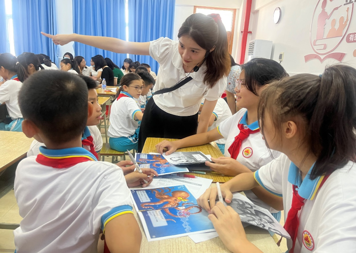 接着,港口镇小学英语教研组长蔡东琳老师进行优秀绘本课例展示,与港口镇群众小学六年级的学生共同呈现了一节生动又高效的绘本阅读课例——“Octopus is a friend”。蔡老师通过Free talk巧妙导入,从而激发学生的知识背景和学习动机,再利用图片环游的形式,帮助学生逐步深入理解故事内容,引导学生感悟故事内涵。本节课例教学目标明确,条理清晰,层次分明,多维度地培养了学生的英语学科核心素养。