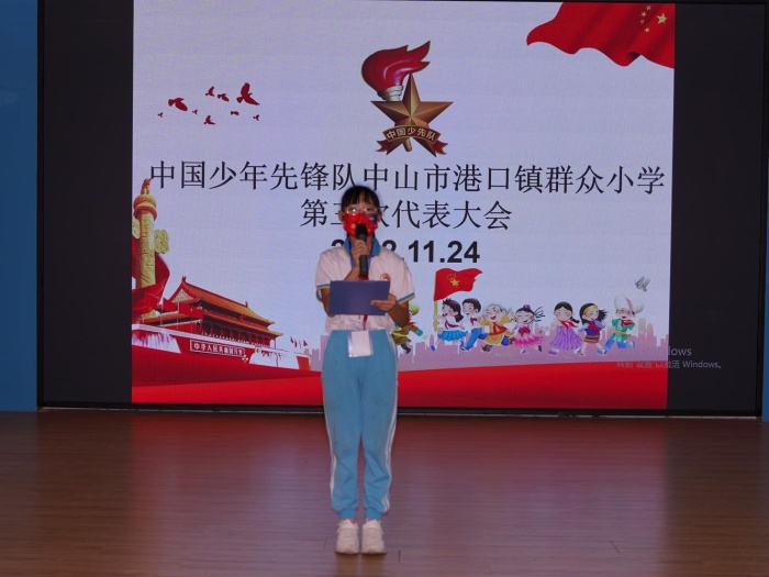 下午3:45,主持人宣布大会开始。会议在嘹亮的国歌声中拉开序幕,全体代表起立,伴随着铿锵有力的《出旗曲》,旗手们迈着整齐的步伐走来,鲜红的队旗指引前进的方向,全体代表高唱《中国少年先锋队队歌》。接着第三届大队委作少先队工作报告;随后,主持人宣读中国少年先锋队中山市港口镇群众小学第三届少工委候选人名单,并全票通过了第三届学校委员名单。主持人还宣读群众小学第五届大队委候选人名单,并全票通过。群众小学第三届少工委主任梁铨华为少工委副主席卢金连、彭峰颁发聘书,并合影留念。