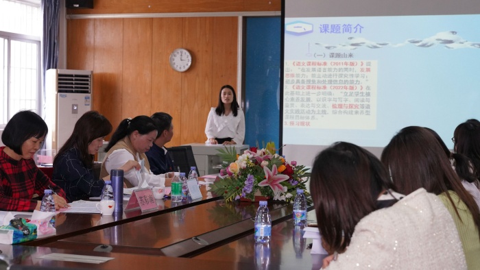 随后,课题负责人苏淑忆老师作课题中期汇报,对课题目前的研究情况作介绍,主要从课题由来、研究目标与内容、研究现状及阶段性成果等作详细阐述。