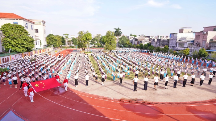 首先,全体师生进行庄严的升旗仪式,共唱国歌。