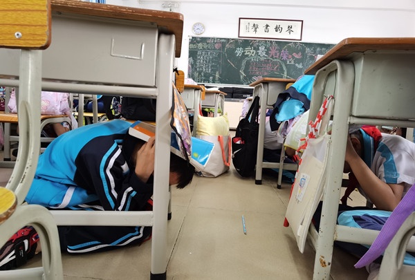 随着第一次警报响起,所有负责安全疏导的老师迅速到位,在走廊、楼梯口等处协助学生疏散逃生。正在上早读的孩子们在老师的指挥下,有的迅速蹲到课桌下,双手紧紧抱着头,有的立马用书包、书本等物品护住头部、颈部等人体要害部位。第二次警报音一响,孩子们立马从指定路线撤离,并做到神态严肃紧张,快速有序。同时,所有楼层的指挥老师也发挥着组织疏导者的作用,确保孩子们有序、安全、迅速地撤离教学楼,避免学生之间发生拥挤或者踩踏事件。各班到达指定的安全地点后,迅速清点人数,并由班长向德育原家惠副主任汇报。从第二次警报声响起到全体师生安全集中完毕,仅仅用了1分15秒,达到了预期效果。