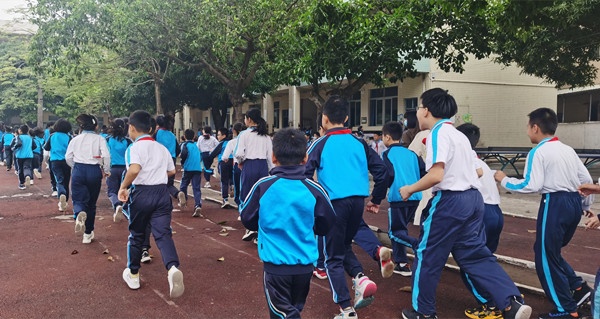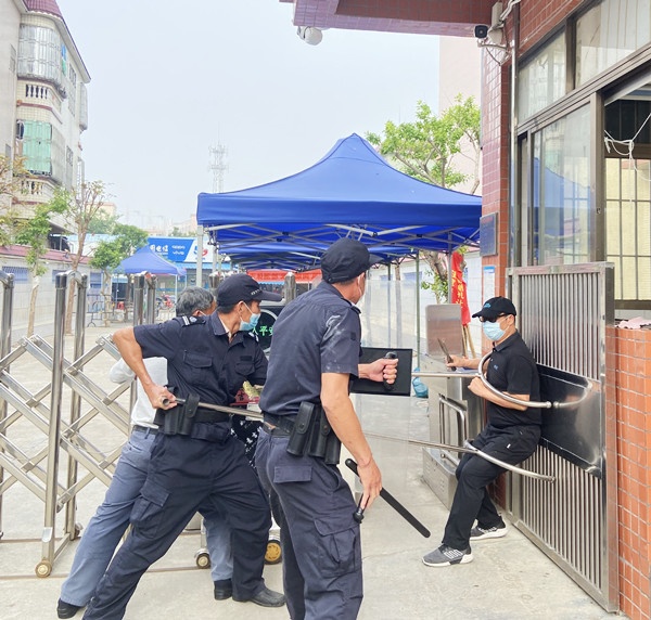 演练开始,师生们正在操场上开展大课间活动。这时,一名男子来到学校门口,大声吵闹。值班门卫迅速带着警棍上前劝阻,该男子不以为然,反而拿刀具强行闯进校门,另一门卫见状,立即报告校长并通过“一键紧急报警系统”向公安部门报警。校长接报后,马上指示梁森明主任联系杨琼威老师。紧接着,杨老师连忙利用广播通知师生校门口发生暴力事件,现启动学校防恐防暴应急预案,请学校护卫队以最快速度到达门口参加护校工作,协助撤离的老师快速到指定站点,各班主任组织学生有序、迅速撤离回课室。随即警报拉响,605名学生仅用了45秒便全部安全撤回到课室,当即开展了锁门关窗,用凳子、桌子抵住门窗等一系列的护班行动。此时,安全护卫队员与保安人员一起奋不顾身、临危不惧,围追堵截“暴徒”,终于成功制服“暴徒”,圆满完成了演练预定任务。