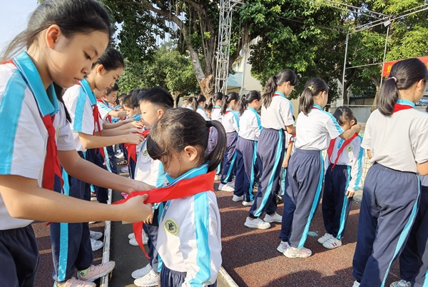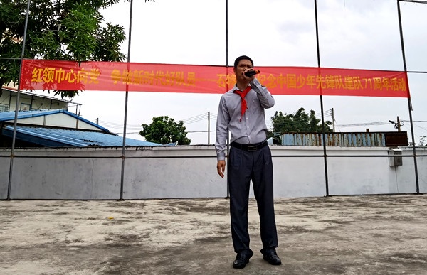 鲜艳的红领巾在胸前飘扬,星星火炬在队旗上闪光,少先队队员代表为大家献上了诗朗诵。队员们的声音在校园里回荡,在金秋的暖阳下升腾成希望。最后,学校少工委主任梁容根校长寄语全体队员,希望大家要树立远大理想信念,积极践行社会主义核心价值观,要有一颗自律自信自立自强的爱国心。同时,也希望大家要从小事做起,从身边事做起,积极做德智体美劳全面发展的社会主义建设者和接班人。
