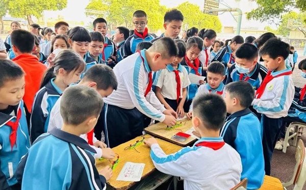 同学们最为期待的科技游园体验活动开始啦!活动现场共设置了15个摊位,各个摊位前都排起“长龙”,同学们拿着积分卡穿梭于每个游戏摊位,他们纷纷沉浸其中,小小的科学梦想在潜移默化中生根发芽。“兑奖处”的欢笑声、喝彩声也溢满整个校园。