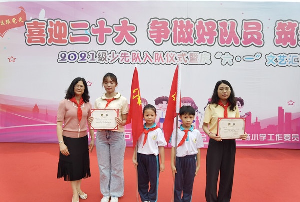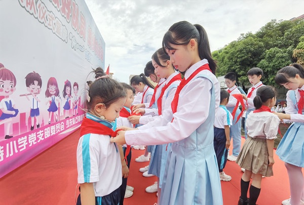 入队仪式上,队旗熠熠生辉,队歌嘹亮动人,六年级队员为新队员佩戴红领巾。当鲜艳的红领巾佩戴在胸前的那一刻,新队员们的肩上便多了一份为共产主义事业奋斗的大任。随后,新队员们在鲜艳的队旗下高举右手,庄严宣誓,立志成为一名合格的少先队员。高举红色队旗,传承红色基因。苏校长为新建中队授中队旗,并为中队辅导员颁发聘书。同时,苏校长面向全体人员亲切致辞,她向全校儿童致以最诚挚的节日祝福,希望同学们在少先队活动中培养理想信念、强健体魄、磨练意志,成为有理想,有本领,有担当的新时代好队员。最后,入队仪式在队员们铿锵有力的呼号声中落下帷幕。