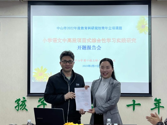春意正浓,“研”途花开,静待硕果。为提升课题研究工作的实效,促进课题研究工作的顺利进行,近日,港口镇石特小学举行了市级教育科研立项课题《小学语文中高段项目式综合性学习实践研究》开题报告会。本次开题活动特别邀请了中山市教育教学研究室小学语文教研员梁雪菊老师、港口镇教育与体育事务中心张育文主任、刘浩平副主任、苏彩南老师等专家莅临指导。石特小学苏少丽校长、课题组全体成员参会,会议由教务处詹婉莹副主任主持。