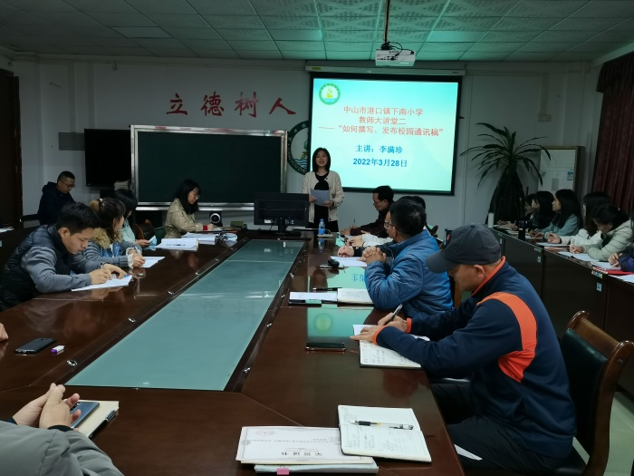 为了提升学校老师撰写校园通讯稿的质量,提高学校通讯稿的发布率,2022年3月28日下午,在港口镇下南小学三楼会议室举行了以“如何撰写、发布校园通讯稿”为主题的讲座。全体教师均参加了本次讲座。