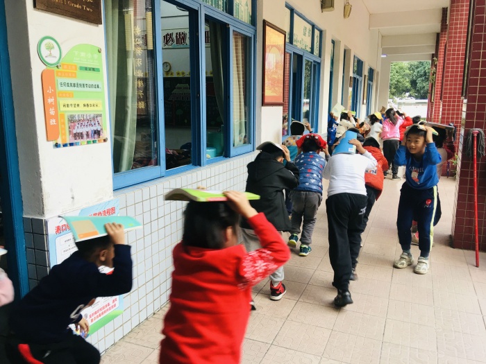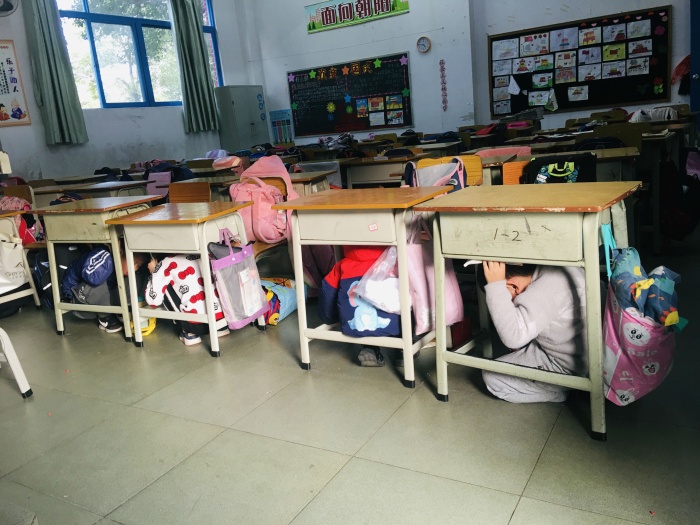 下午16点40分,广播发出地震避险警报信号,意为此时感知地震等灾害发生,学生就地躲避,将身体缩成一团,用手护住头和胸,躲在课桌底下,各教职工迅速到达各自岗位。