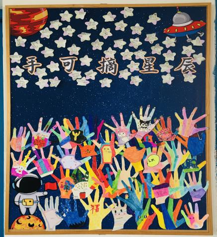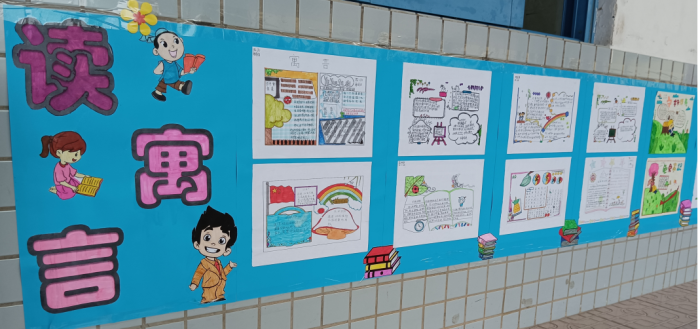 看!设计规范美观的墙报;布局雅致的“传统文化墙”;催人奋进的“名言墙”,内墙外墙排布规整的手抄报作品,还有五彩斑斓的绘画作品,以及各班公示的班名、班训、班级口号、班级目标、班歌、班徽、班规、班级合照、教师寄语等,小小的教室无不彰显出师生们的智慧和艺术才华。