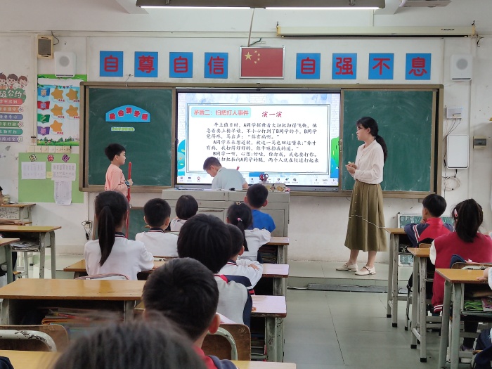 低年级组吴莲莲老师以《拨矛盾乌云,见和谐之光》为题,选取的情境素材具有典型性,贴近学生生活和实际;课堂形式灵活多样,大家利用讨论、访谈、情景再现等多种方式,富有教育性。