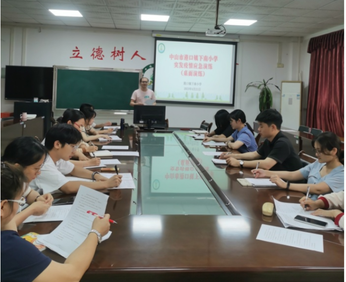 4月23日下午,港口镇下南小学安全处陶嘉骏主任和全体班主任在学校会议室开展桌面演练。