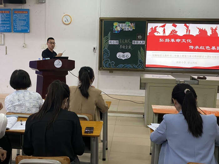 为促进理解《义务教育语文课程标准(2022年版)》的理念和要求,提升教师驾驭教材的能力和水平,促进教师之间的相互交流学习,11月23日下午,港口镇小学语文二年级上册第六单元教材解读与课程标准实施研讨活动在港口镇西街小学多媒体室举行。参加此次研讨活动的有镇教育和体育事务中心苏彩南老师,港口镇小学语文中心教研组组长吴高欣主任,港口镇各小学二年级语文教师,西街小学梁容根校长、徐艳丽副校长以及西街小学全体语文教师。本次活动由西街小学语文科组长施秋怡老师主持。