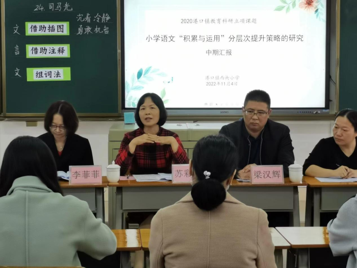 为更扎实地推进教育科研工作,确保课题研究的实效性,提升课题研究质量,11月7日上午,西街小学镇级立项课题“小学语文‘积累与运用’分层次提升策略的研究”中期报告会在大多媒体室召开。出席本次报告会的人员有港口镇教育事务中心的苏彩南老师、民主小学李菲菲副校长、下南小学教务处梁汉辉主任,西街小学梁容根校长、徐艳丽副校长以及课题组的全体老师们。会议由西街小学语文科组长施秋怡老师主持。