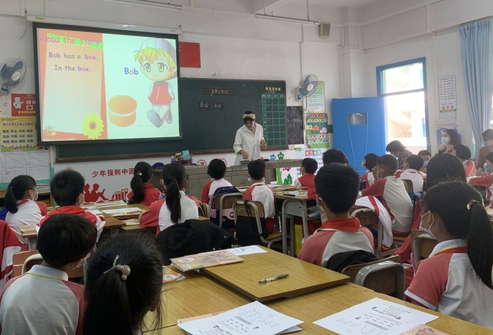 教务主任杨雨展示了三年级元音字母[?]发音的语音拓展课。鉴于三年级的学生活泼好动,模仿意识强,杨主任在课前利用字母操让学生重温了26个字母的发音。通过Bob和Tod这两个孩子的小故事以旧引新,通过模仿聆听、观察感悟、实践运用,开展字母O的语音教学。学生们在小组内进行发音练习,在合作中提升自我。
