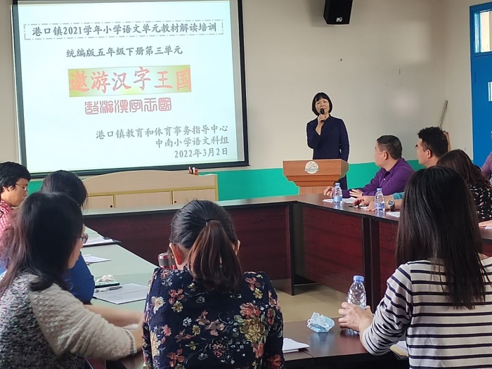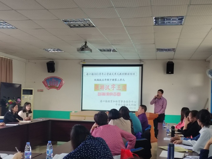 为贯彻落实教育部统编教材编写理念和语文教学思想,关注单元整体教学,为教师更好地使用统编教材提供研究和实践。3月2日下午,港口镇小学语文五年级下册综合性学习“遨游汉字王国”教材解读专题教研活动在中南小学举行。港口镇教育和体育事务中心苏彩南老师及全镇小学五年级的语文教师参加了此次活动。
