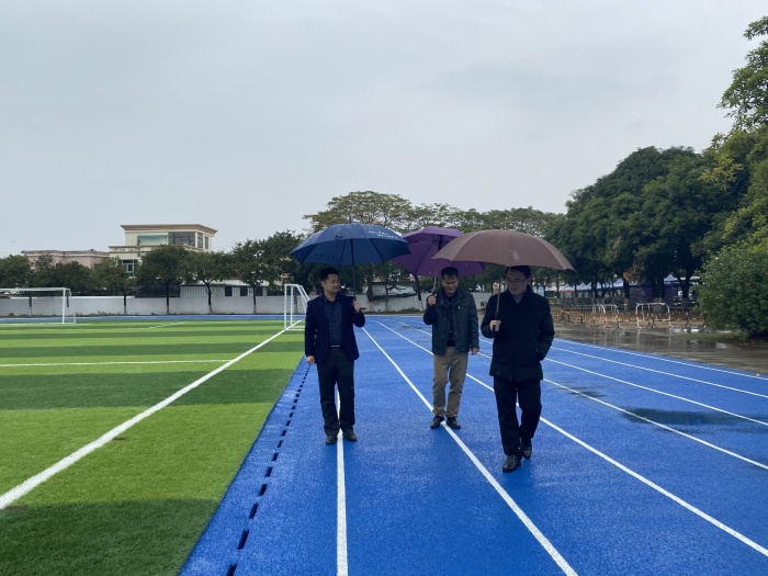 2021年12月27日上午,港口镇副镇长易昊宏、教体文旅局后勤专干孙伟锋莅临中南小学,在学校校长黄权炎的陪同下开展调研工作,易镇长和孙专干到学校便直奔新运动场方向查看建设情况,对运动场落实情况进行实地查看,仔细查看了运动场的排水口、跑道面层塑料、人工草皮等区域,并对塑胶跑道的道牙不够显眼给出了针对性建议,要求学校把好安全关,对中南小学在运动场建设的工作表示肯定。