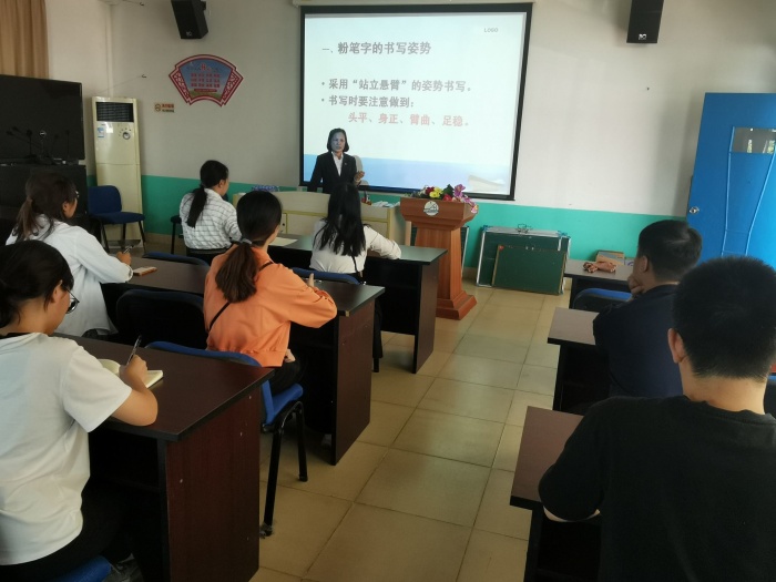 字乃人之衣冠,一手漂亮的粉笔字,是教师应具备的一项重要的基本功。教师的字就是学生的字帖,一笔一画都给学生起着示范引领的作用。教师粉笔字的书写水平直接关乎教师的自身形象和课堂教学效果。本次培训由该校已有多年教学经验的语文教师黎瑞华老师主持,她在培训中对青年教师提出了殷切期望,并就粉笔字的书写技能、技法进行了专业的指导。