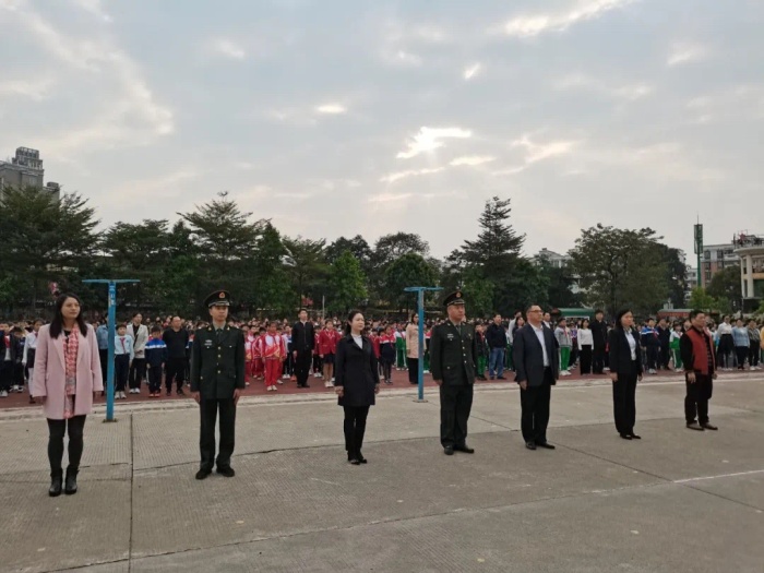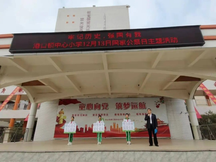 中山市港口镇政府武装部贺洪彪部长、港口新港社区仇晓媚书记、家长代表以及全校师生参加了主题升旗仪式。