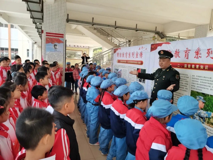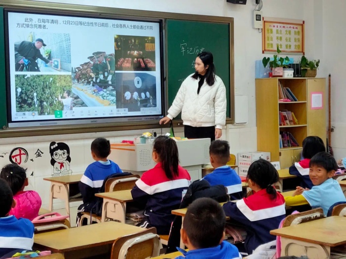 主题班会课上,各位班主任通过播放图片、视频,对国家公祭日设立的意义进行深入浅出的讲解,引导队员深刻了解“国家公祭日”的内涵,激励队员勿忘国耻,振兴中华。而在学校的国防宣传栏前,贺部长更是领着孩子们讲国防知识、讲祖国的军事的日益强大、讲自己的军旅故事……孩子们听得很入迷,好奇地询问着、分享着,当兵卫国的种子悄然发芽了!