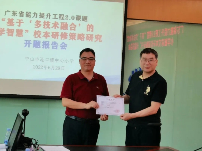 首先,徐艳丽副主任简要介绍了学校基本情况和课题的相关情况。本课题是基于港口镇中心小学在成为中山市信息技术能力提升工程2.0实验校后,开展了系列的研修,并取得了一定的前期研究成果基础上于2022年4月申报,经专家评审,该课题于2022年6月成功立项为广东省中小学教师信息技术应用能力提升工程办公室的省级课题。中山市教师发展中心中小学教师信息技术应用能力提升工程2.0项目办公室吴寒冬主任宣读了课题立项通知书。